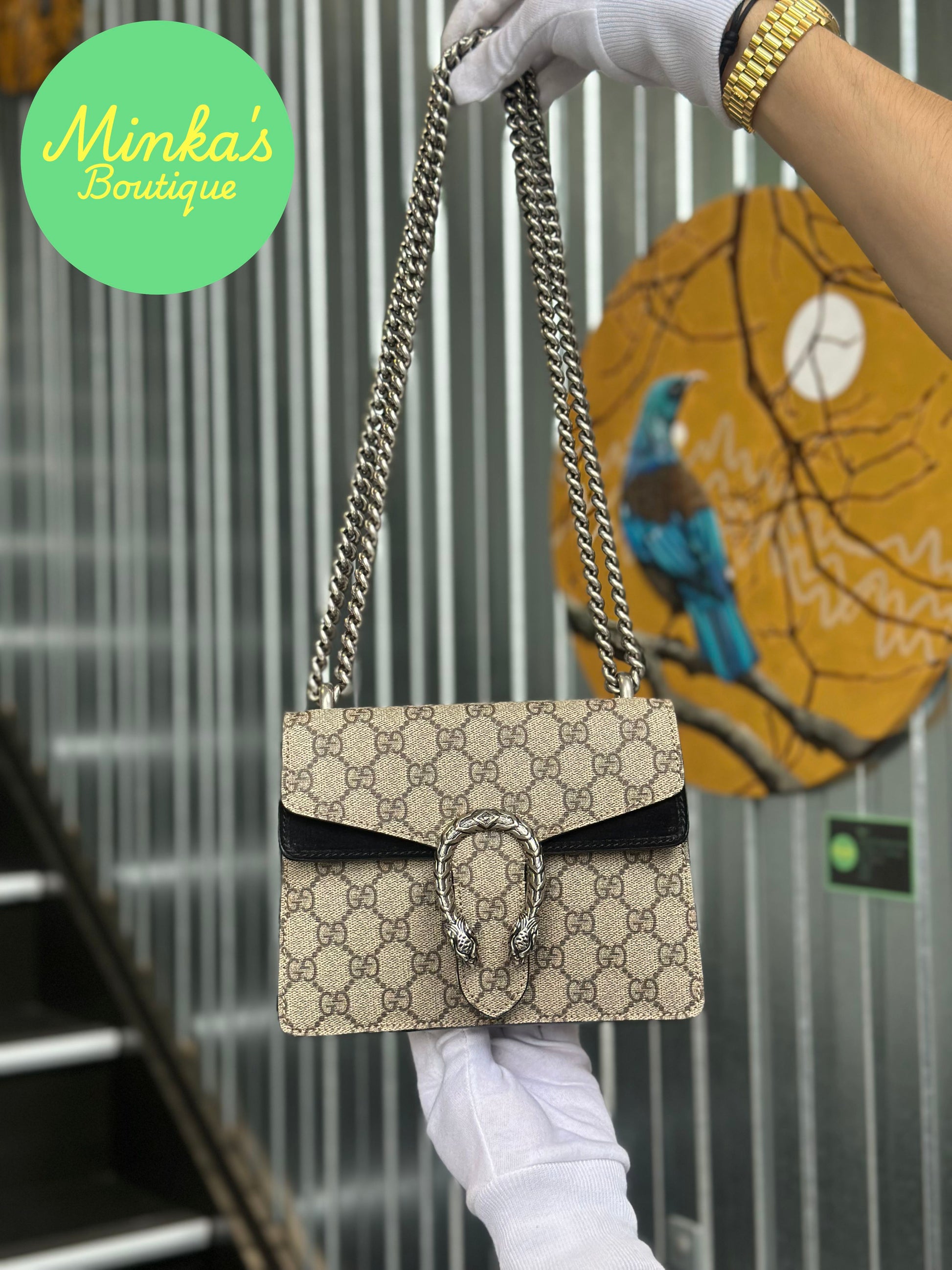 Description: A stunning and iconic piece from Gucci, this Dionysus small bag is a must-have for any luxury collection. Crafted from the signature beige GG Supreme canvas with elegant taupe suede accents, it features the instantly recognizable tiger head spur closure - a detail inspired by the Greek god Dionysus. Its compact size and versatile chain strap make it perfect for carrying your essentials, whether worn as a crossbody or on the shoulder.