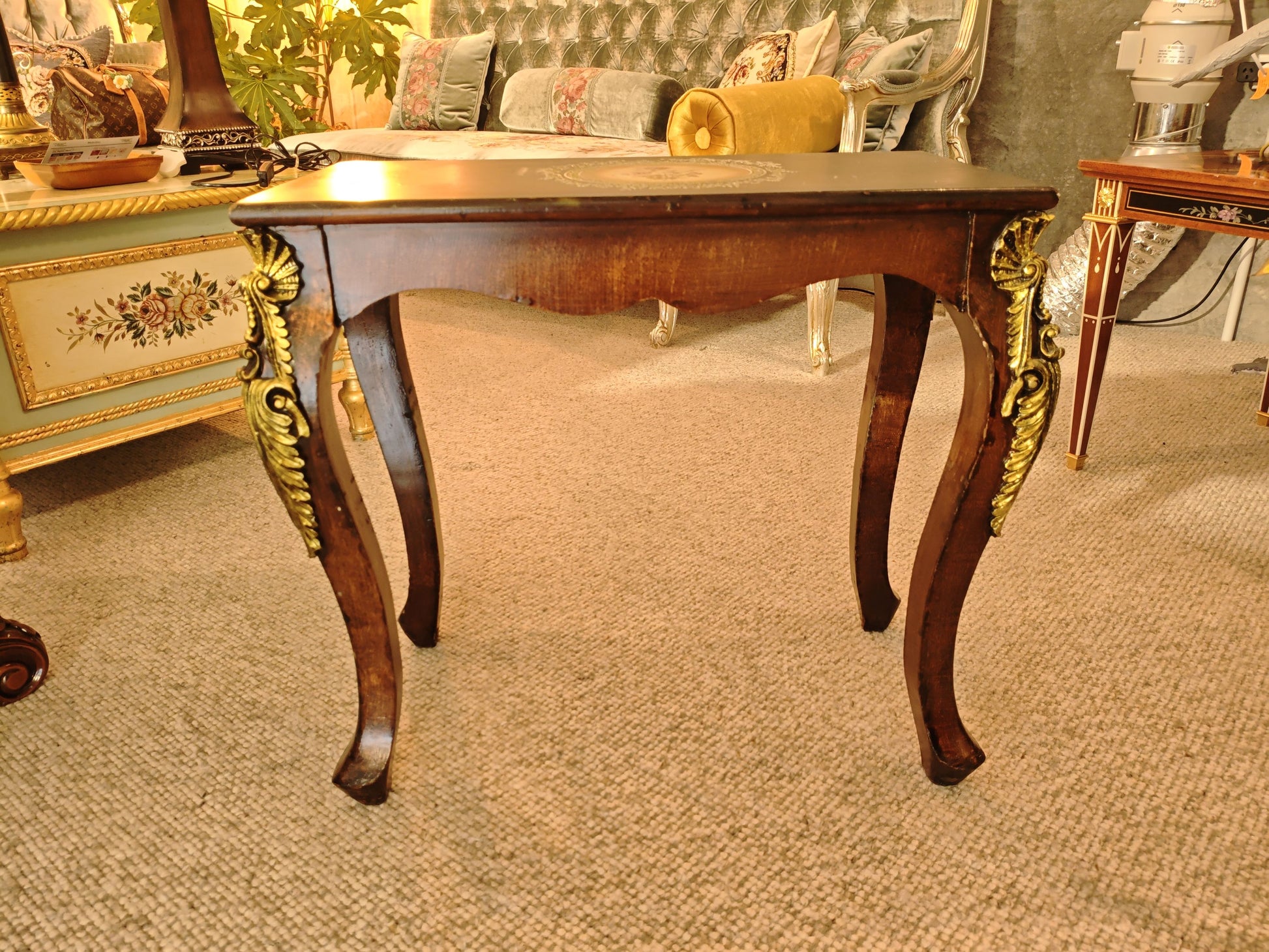 Gold Ormolu Accents: The gracefully curved cabriole legs are adorned with highly detailed, sculpted gold ormolu mounts, adding a touch of opulent glamour.